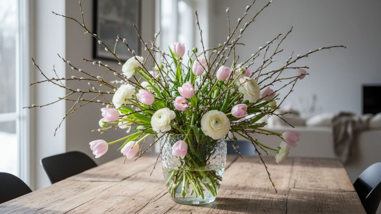 2. Pajunoksat ja kissat: Muutama pitkä, suora ja pörröinen pajunoksa kimpun korkeimmaksi pisteeksi rikkoo pyöreän muodon välittömästi ja tuo asetelmaan keväistä pystysuuntaista linjaa.
