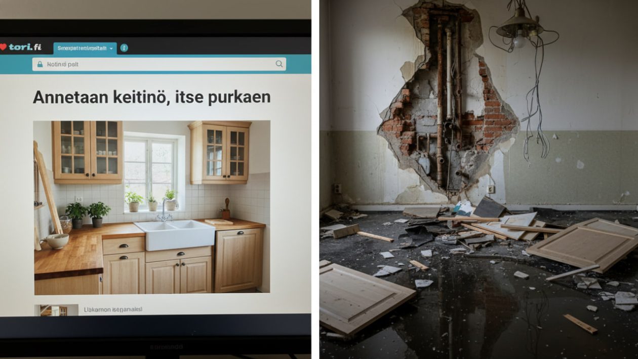 Remonttifirmat veloittavat vanhan keittiön purkamisesta ja kaatopaikkamaksuista satoja, jopa yli tuhat euroa. Siksi asunnon omistaja laittaa nettiin ilmoituksen: ”Keittiö ilmaiseksi itse noutaen”.
