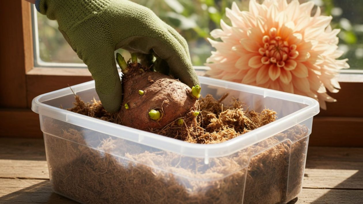 Hautaamaton lepäily: Aseta daalian juurakot kevyesti tämän kostean pedin päälle. Älä peitä niitä kokonaan! Jätä juurakon yläosa ja kaula (josta silmut nousevat) täysin paljaaksi ja ilmaan. Sulje pussi tai laatikon kansi löyhästi, jotta kosteus pysyy sisällä, mutta ilma pääsee kiertämään (estää homehtumisen). Nosta laatikko valoisaan ja lämpimään paikkaan (n. +20 astetta).