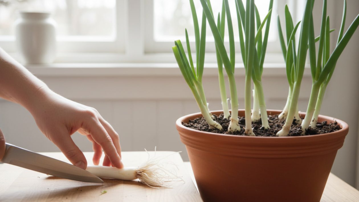 Kun ostat nipun kevätsipulia (esim. S-marketista tai Lidlistä), huomaat, että varsien alaosassa on usein jäljellä pieni, kova valkoinen tyvi ja kuivahtaneita juurenhapsuja.