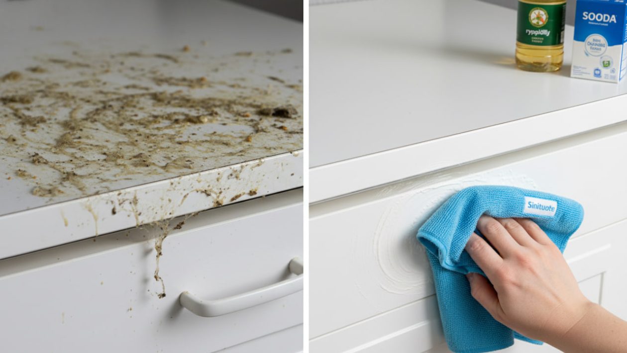 Tämä niksi toimii täydellisesti liesituulettimen rasvaisiin pintoihin, keittiökaappien oviin, vetimiin ja erityisesti kaappien päällysiin.