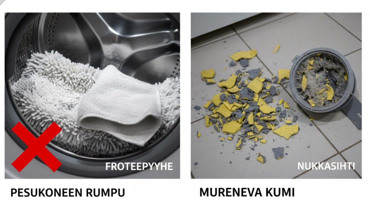Koneen sydänkohtaus: Nämä mikroskooppiset ja isommatkin kuminpalaset eivät huuhtoudu viemäriin, vaan ne päätyvät suoraan pesukoneen nukkasihtiin ja poistopumppuun. Kumi tukkii pumpun täysin, ja pahimmassa tapauksessa polttaa moottorin rikki, mikä tarkoittaa useiden satojen eurojen huoltolaskua. Lisäksi irronnut kumi tarttuu usein muihin vaatteisiin ikävinä, sulaneina tahroina.