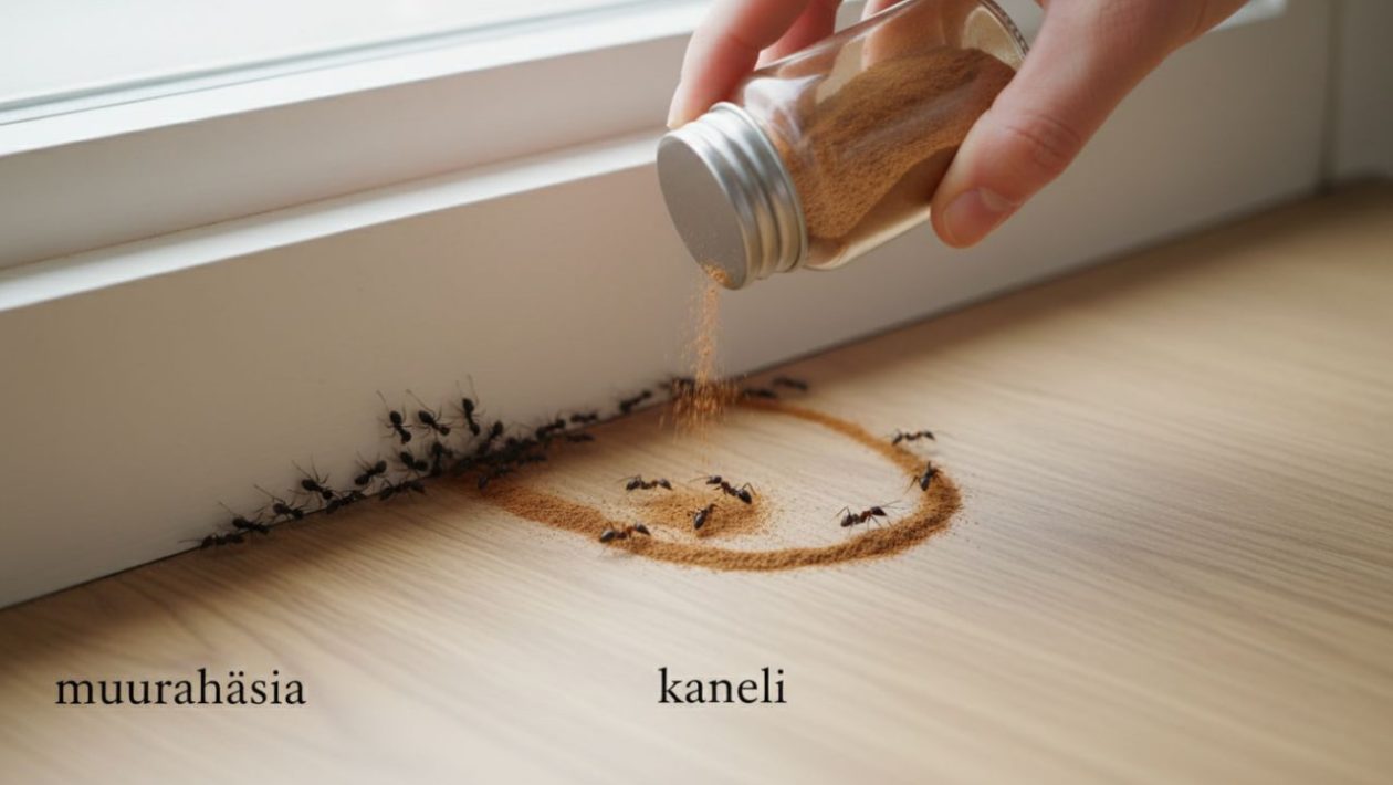 Pese vanha reitti pois: Ennen kanelin käyttöä, siivoa muurahaisten kulkureitti. Pyyhi lattialista ja lattia huolellisesti lämpimällä vedellä, johon on sekoitettu loraus kirkasta Rajamäen väkiviinaetikkaa tai vahvaa pesuainetta (esim. Mäntysuopaa). Etikka itsessään neutraloi vanhan feromonijäljen tehokkaasti.