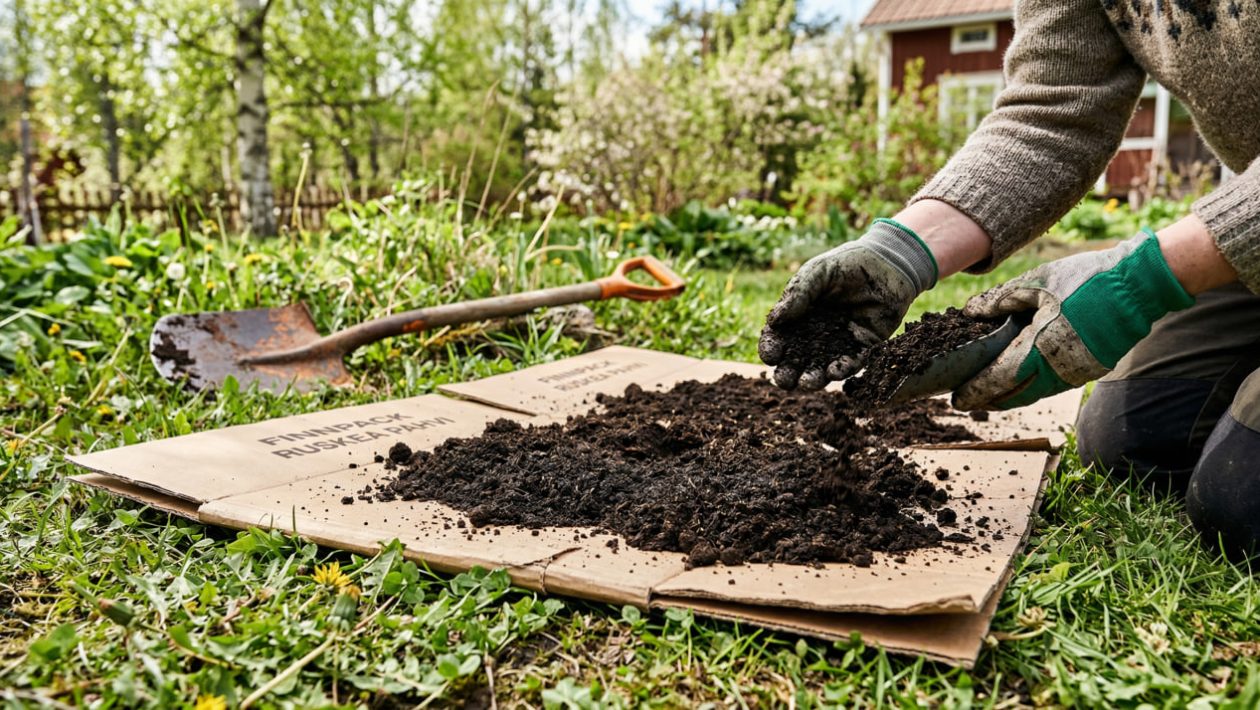 1. Pahvimaton levitys: Älä kaiva senttiäkään! Tasoita vain pisimmät heinät tai rikkaruohot maata myöten (voit jopa astua niiden päälle). Levitä sen jälkeen maahan tiivis kerros puhdasta, ruskeaa pahvia (poista kaikki muoviteipit ja niitit!). Pahvi toimii täydellisenä valo- ja fyysisenä esteenä. Se tukahduttaa allaan olevat rikkaruohot kuoliaaksi muutamassa viikossa.