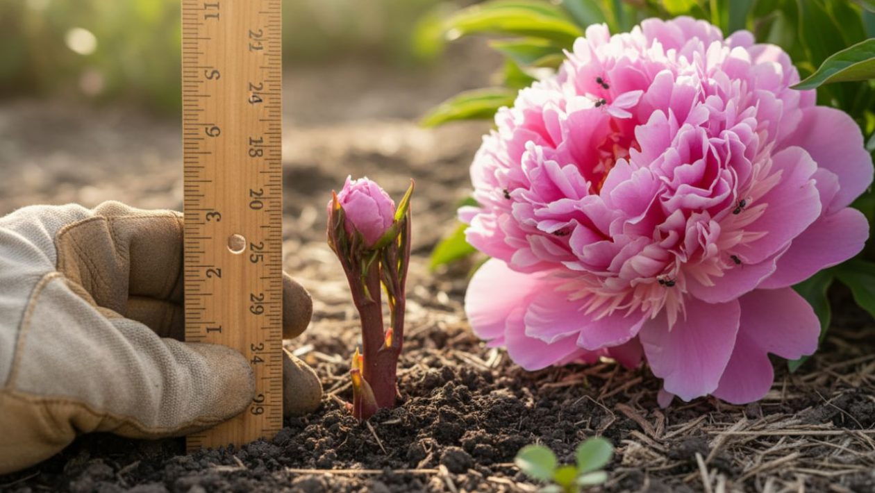 Miten pioni sitten istutetaan oikein toukokuussa, jotta se kukkii runsaasti jo ensimmäisinä vuosinaan? Ratkaisu on mittanauhan tarkka.