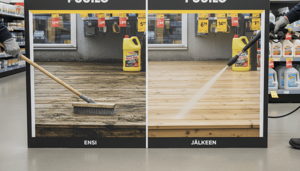 Kyse on terassien ja pihakiveyksien puhdistukseen tarkoitetusta edullisesta tehopesuaineesta ja siihen yhdistettävästä erikoisharjasta. Someryhmissä, kuten kymmeniä tuhansia jäseniä keräävässä Siivousvinkit-ryhmässä, jaetaan nyt hurjaa vauhtia ”ennen ja jälkeen” -kuvia. Kuvissa talven vihertämä, sammaloitunut puuterassi muuttuu uudenveroiseksi vain minuuteissa – ilman kallista Kärcherin painepesuria.