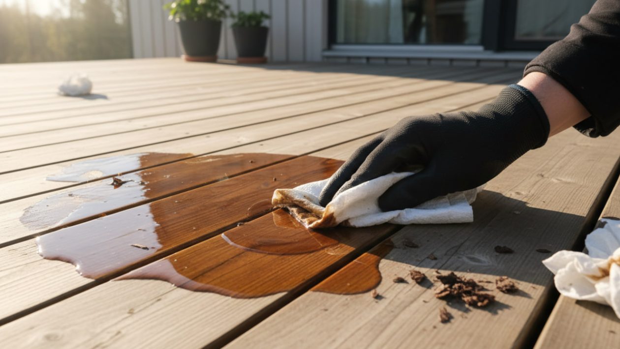 Miten tahmean terassin kirouksesta sitten päästään eroon, ja miten öljyäminen tehdään kerralla oikein? Vastaus on yllättävän yksinkertainen, ja se vaatii vain yhden lisätyövaiheen ja rullan tavallista talouspaperia tai puhtaan, nukkaamattoman puuvillarätin.