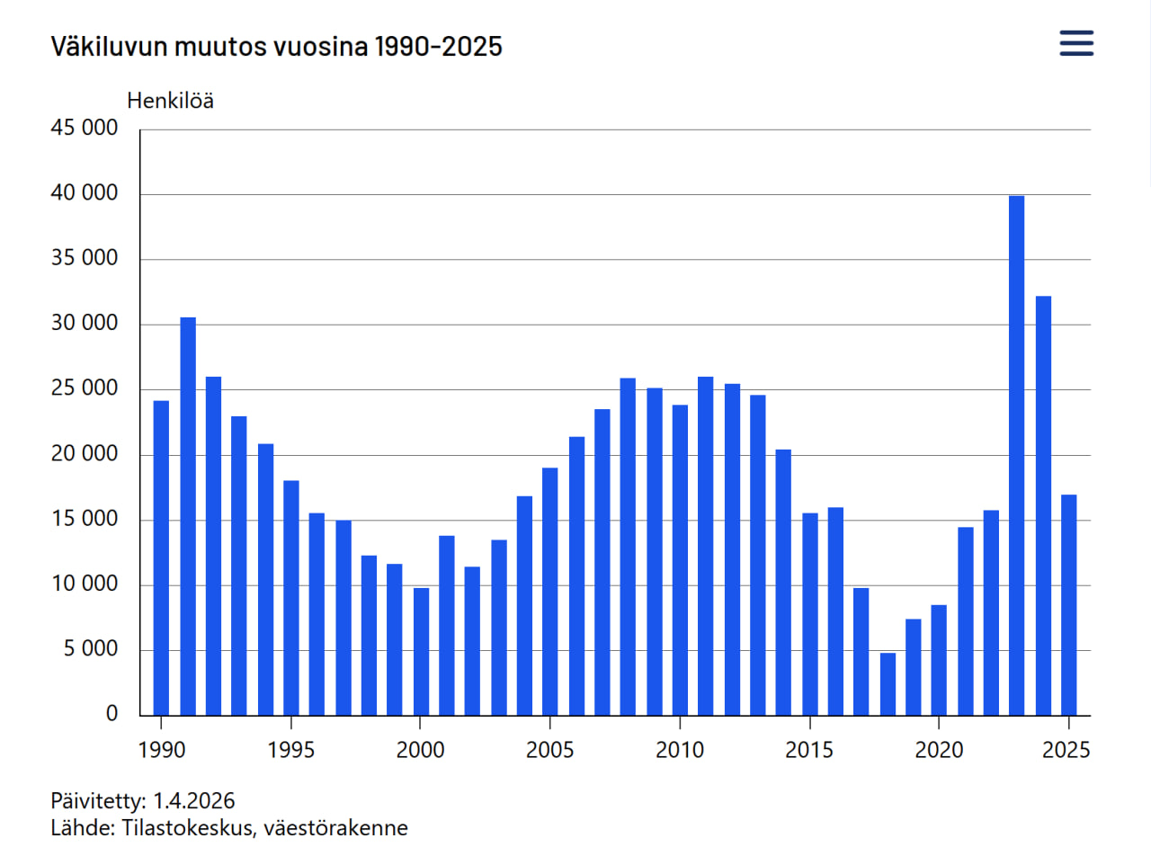 ”Hallituksen alkuvuodesta 2026 voimaan astuneet, huomattavasti tiukemmat maahantulo- ja oleskelusäännökset ovat purreet odotettuakin kovemmin. Nettomaahanmuutto on pudonnut vuodessa lähes 14 000 hengellä. Kun yhdistämme tämän siihen, että kanta-suomalaisten määrä vähenee kiihtyvällä tahdilla ja kansakunnan mediaani-ikä on kivunnut jo yli 43 vuoden, yhtälö on huoltosuhteen kannalta kestämätön”, väestötutkijat varoittavat.
