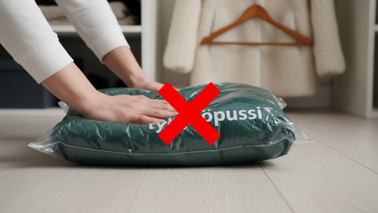 Untuva ja höyhen (Takit, peitot, tyynyt): Untuvan koko lämmöneristyskyky (fill power) perustuu sen herkkään, pörröiseen rakenteeseen. Tyhjiöpussin armoton paine murtaa untuvahaivenet fyysisesti. Kun otat kalliin untuvatakkisi syksyllä pussista, sen täyte on muuttunut koviksi paakuiksi, eikä se enää koskaan pöyhidy takaisin. Ainoa oikea säilytys: Pese untuvatakki huolellisesti (käytä kuivausrummussa tennispalloja!) ja säilytä se väljästi ripustettuna hengittävässä kangaspussissa tai henkarilla kaapissa.