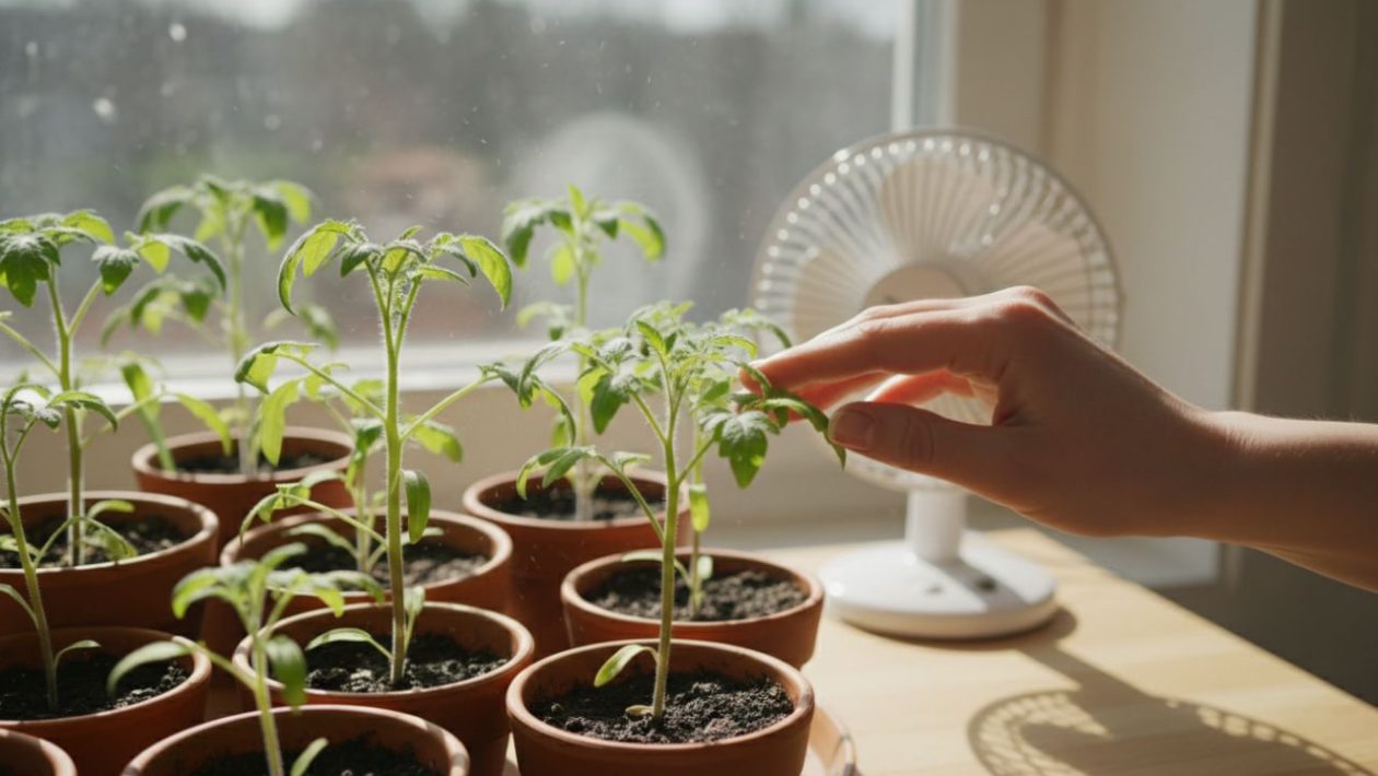 Tee näin: Aseta tuuletin ikkunalaudan viereen ja laita se puhaltamaan kevyesti taimia kohti noin 10–15 minuutiksi kerran tai kaksi päivässä (ei jäätävän kylmää ilmaa, vain kevyt vire). Taimien tulisi heilua vienosti tuulessa. Tämä ”kuntosalitreeni” vahvistaa tomaattien ja chilien solurakennetta huimasti viikossa.